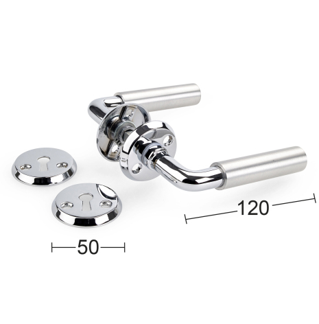 Dörrhandtag och nyckelskylt av mässing med grepp av Aluminium. Passar till dörrtjocklek 38-42 mm. Utsprång 58 mm.
