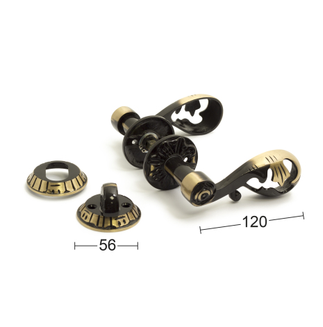 Dörrhandtag av mässing med öppen baksida. Passar till dörrtjocklek 38-60 mm. Utsprång 70 mm. Levereras med 11 mm cylinderring och vred.