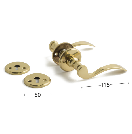 Dörrhandtag och nyckelskylt av mässing. Passar till dörrtjocklek 38-42 mm. Utsprång 58 mm.