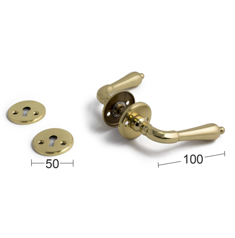 Dörrhandtag och nyckelskylt av mässing. Passar till dörrtjocklek 38-42 mm. Utsprång 65 mm.