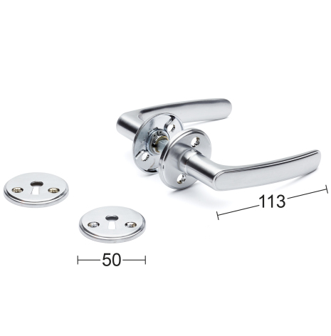 Dörrhandtag och nyckelskylt av zink/zamak. Passar till dörrtjocklek 38-42 mm. Utsprång 50 mm.