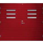 Garagedörr i modern stil med tre horisontella klarglas per sida. Spårfräst dekor i form av liggande panel.