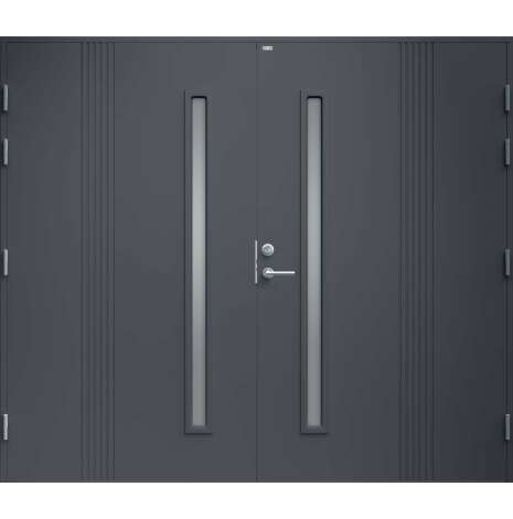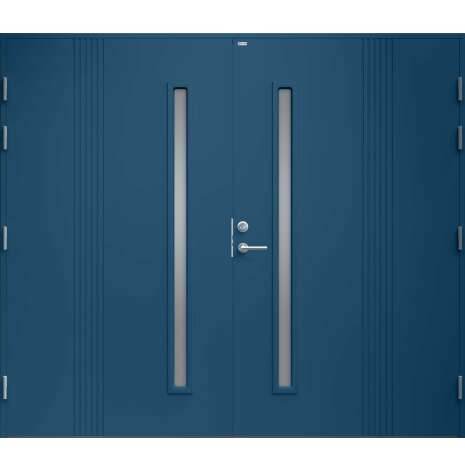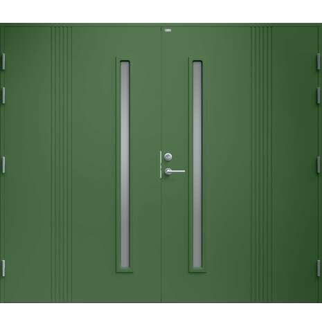 Garagedörr i modern stil med stående dekorspår och två smala, stående klarglas. Som standard är dörren Vit (NCS S0502-Y).
