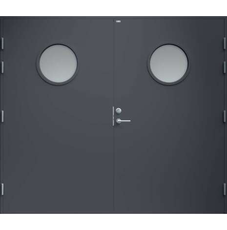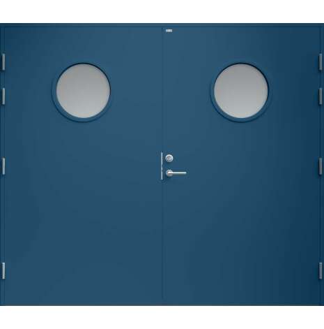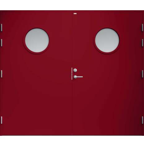 Garagedörr med helt slät yta utan dekor och två runda klarglas. Som standard är dörren Vit (NCS S0502-Y).