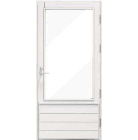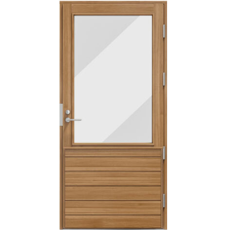 Dörrarna är klädda ut- och invändigt med kvistfri, massiv furupanel och lasyrbehandlade i valfri standardkulör. Levereras utan beslag. U-värde från 0,71.