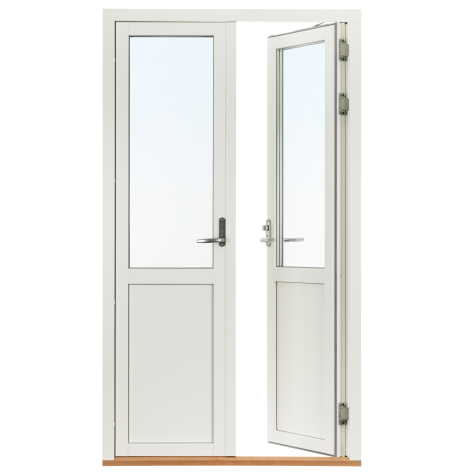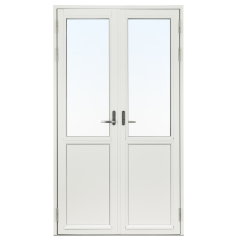 Dessa pardörrar har en glasruta upptill och sedan bröstning. Det gör att glasrutans nedre kant bör linjera med fönster som sitter i anslutning till dörren. Du kan därmed välja om bröstningen ska matcha med fasta eller öppningsbara fönster.