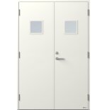 Kvalitetsytterdörr från NorDan - Bor parytterdörr - Kuben 819PG med ett kvadratiskt glas i vardera dörrblad. I övrigt slät utan spår eller dekor. Svensktillverkade ytterdörrar av robust konstruktion med dubbla stålplåtar, extra klimatpackning samt kraftig, 56x105 mm, lamell-limmad, fingerskarvad och vakuumimpregnerad karm. Ytterdörren levereras med låskista ASSA 2002, utan cylinder och trycke. Handikappvänlig kantregel för enkel öppning och låsning av det passiva dörrbladet.