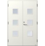 Kvalitetsytterdörr från NorDan - Bor parytterdörr - Kvadraten 839PG3, med 3 kvardratiska glas i båda dörrbladen. Svensktillverkade ytterdörrar av robust konstruktion med dubbla stålplåtar, extra klimatpackning samt kraftig, 56x105 mm, lamell-limmad, fingerskarvad och vakuumimpregnerad karm. Ytterdörren levereras med låskista ASSA 2002, utan cylinder och trycke. Handikappvänlig kantregel för enkel öppning och låsning av det passiva dörrbladet.
