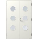 Kvalitetsytterdörr från NorDan - Bor parytterdörr - Planeten 836PG3, med 3 runda glas i båda dörrbladen. Svensktillverkade ytterdörrar av robust konstruktion med dubbla stålplåtar, extra klimatpackning samt kraftig, 56x105 mm, lamell-limmad, fingerskarvad och vakuumimpregnerad karm. Ytterdörren levereras med låskista ASSA 2002, utan cylinder och trycke. Handikappvänlig kantregel för enkel öppning och låsning av det passiva dörrbladet.
