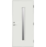 Br.Johansson SY116 är en slät vit ytterdörr med ett smalt avlångt klarglas.