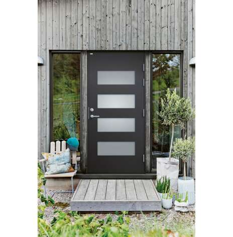 Alma är en elegant ytterdörr helt utan dekor. Dörren har fyra lite större, liggande klarglas. Insidan är slät, men går att få dekorerad som utsidan. Alexandra är en ytterdörr i modern stil med högt, smalt klarglas. Utvändig dekor med djup profil i 6mm HDF-skiva. Insidan är slät, men går att få dekorerad som utsidan. Dörr och karm levereras vit NCS S 0502-Y som standard.