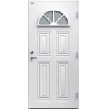 Christine är en ytterdörr i traditionell stil med spårfrästa dekorspeglar. Halvcirkelformat cotswoldsglas beprytt med dekorspröjs. Insidan är slät, men går att få dekorerad som utsidan.