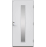 Ytterdörr i modern stil med slät yta och ett centrerat, stående klarglas. Diplomats lagerdörrar levereras endast i standardvit.