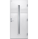 Felicia är en ytterdörr i modern stil med sparsam dekor. Smalt, stående klarglas. Insidan är slät, men går att få dekorerad som utsidan. Dörr och karm levereras vit NCS S 0502-Y som standard.