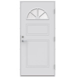 Hanna är en ytterdörr i traditionell stil med spårfräst dekor och halvmåneformat cotswoldsglas med dekorspröjs. Insidan är slät, men går att få dekorerad som utsidan. Dörr och karm levereras vit NCS S 0502-Y som standard.