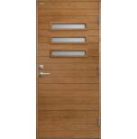 Ingela Ek klarglas är en ytterdörr i modern stil med tre horisontella klarglas. Spårfräst dekor i form av liggande panel. Insidan är slät, men går att få dekorerad som utsidan.