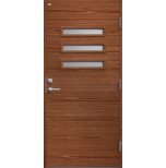 Ingela Teak klarglas är en ytterdörr i modern stil med tre horisontella klarglas. Spårfräst dekor i form av liggande panel i konstteak. Insidan är slät, men går att få dekorerad som utsidan.