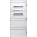 Ingela glas är en ytterdörr i modern stil med tre horisontella klarglas. Spårfräst dekor i form av liggande panel. Finns i ek, konstteak eller valfri kulör. Insidan är slät, men går att få dekorerad som utsidan. Dörr och karm levereras vit NCS S 0502-Y som standard.