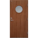 Rosa Teak glas är en ytterdörr med helt slät yta i konstteak utan dekor och runt klarglas.