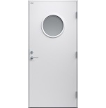 Rosa glas är en ytterdörr med helt slät yta utan dekor och runt klarglas. Välj mellan ek, konstteak eller valfri kulör. Dörr och karm levereras vit NCS S 0502-Y som standard.