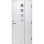 Sandra är en Ytterdörr i modern stil och dekorspår med djup profil i 6mm HDF-skiva. Fyra små, kvadratiska klarglas. Insidan är slät, men går att få dekorerad som utsidan. Dörr och karm levereras vit NCS S 0502-Y som standard.