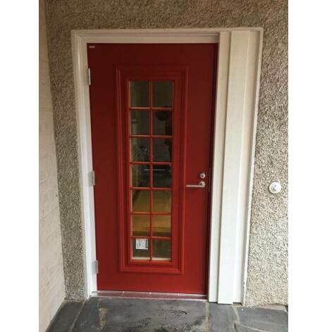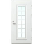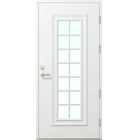 Traditionell design mixad med moderna inslag och dekorlistning. Dörrarna är klädda med väderbeständig HDF-board och lackerade vita som standard men går att få i andra kulörer. Tillverkade i Thermo-utförande, U-värde från 0,59. Som standard släta på insidan. Levereras utan beslag. Kompatibel med Yale Doorman.