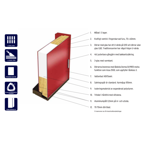 Dörrarna i Herrgårdsserien tillverkas med kraftigt ramträ för bästa stabilitet, har 4 kraftiga justerbara gångjärn med bakkantssäkring och kraftig tröskel med slitskena av aluminium. Standard låskista är Dorma DL 91925 motsv. funktion som Assa 2500 med bortasäkring (hakregellås). 3 lager färg för bästa finish och slitstyrka.