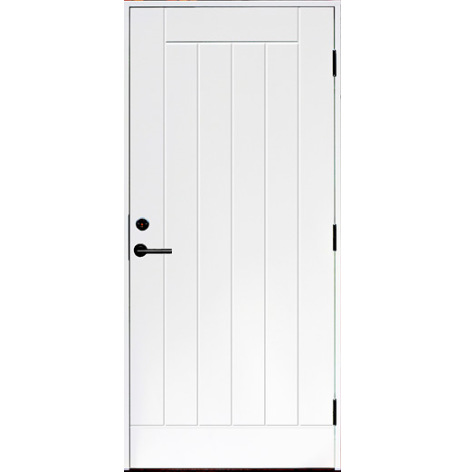 Dörren har ett spårfräst mönster på utsidan med slät insida. Stomme i furu med fyllning av 55 mm polystyren. Aluminiumplåt på bägge sidor för bra formstabilitet och vitmålad HDF-board (3,2 mm) som ytskikt. 3 st justerbara gångjärn med bakkantssäkring. Levereras med låskista Assa 8765 och justerbart slutbleck.Tjocklek på dörrblad 62 mm. Färdigmonterad karm i vitmålad furu 42x92 mm med handikappanpassad tröskel och förborrade karmskruvshål. OBS: Karmskruv ingår ej.