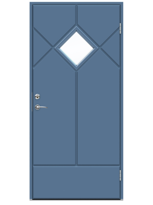 Schumann har dekorlister på utsidan och är slät på insidan. Karm och Dörrblad målade i NCS S0502-Y som standard.