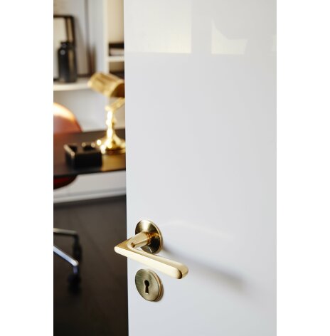 Designat dörrhandtag av mässing. Kombinationen polerad/borstad mässing innebär att rosetten och handtagets baksida är i polerat utförande och framsidan i borstad mässing. Passar till dörrtjocklek 38-42 mm. Utsprång 65 mm.