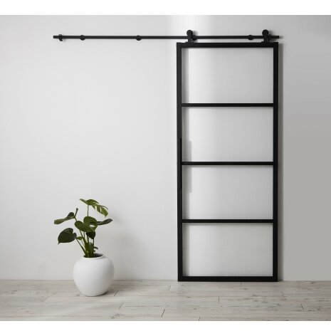 Glasdörr med svart aluminiumprofil. 6 mm härdat klarglas.