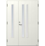 Kvalitetsytterdörr från NorDan - Bor parytterdörr - Linje 302PG2+1, med vertikala spår utvändigt, 2 glas i det aktiva dörrbladet och 1 glas i det passiva. Svensktillverkade ytterdörrar av robust konstruktion med dubbla stålplåtar, extra klimatpackning samt kraftig, 56x105 mm, lamell-limmad, fingerskarvad och vakuumimpregnerad karm. Ytterdörren levereras med låskista ASSA 2002, utan cylinder och trycke. Handikappvänlig kantregel för enkel öppning och låsning av det passiva dörrbladet.