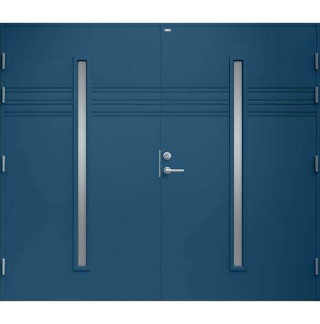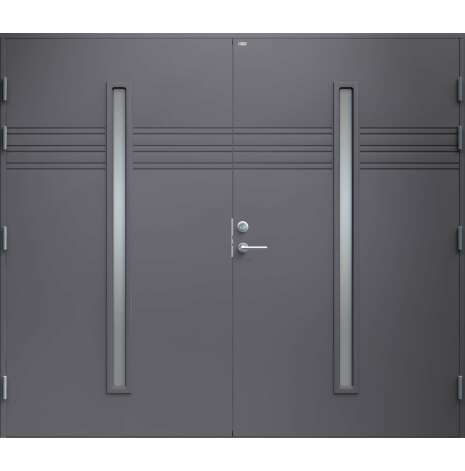 Garagedörr i modern stil med sparsam dekor. Två smala, stående klarglas. Som standard är dörren Vit (NCS S0502-Y).