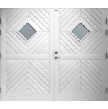 Garagedörr i traditionell stil med diagonal panel i form av spårfräst dekor samt två cotswoldglas. Som standard är dörren Vit (NCS S0502-Y).