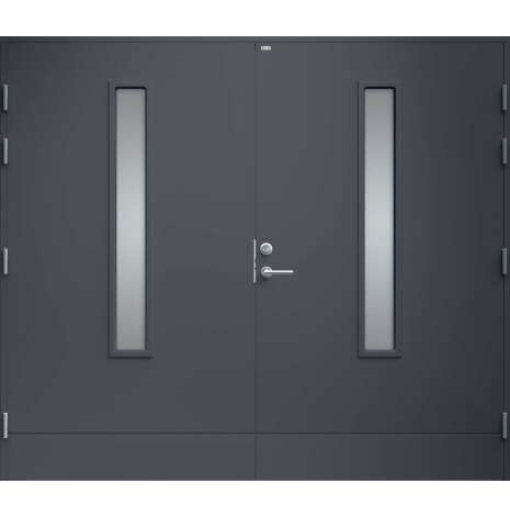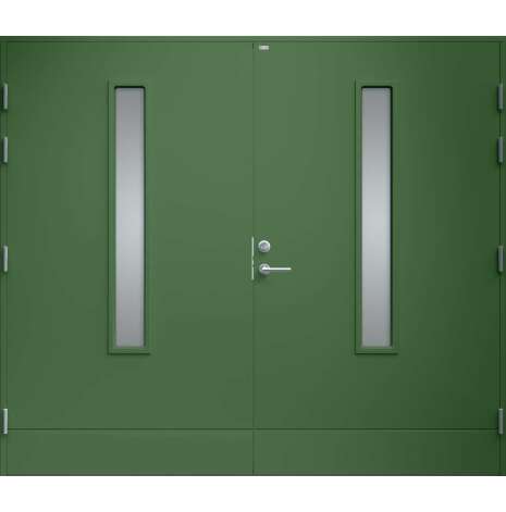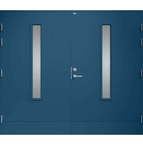 Garagedörr i modern stil, helt slät utan dekor med två smala, stående klarglas. Som standard är dörren Vit (NCS S0502-Y).