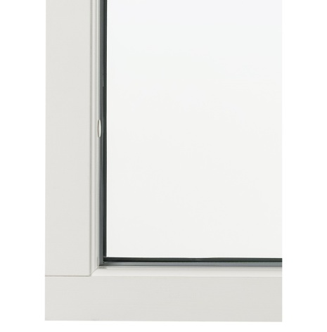 Svenska Fönster Rund profil Trä, karmfast 3-glasfönster. Vitmålat NCS S 0502-Y på alla trädelar. Glaslister och spröjs i vit aluminium på vitmålade produkter, trä på laserade/övriga kulörer