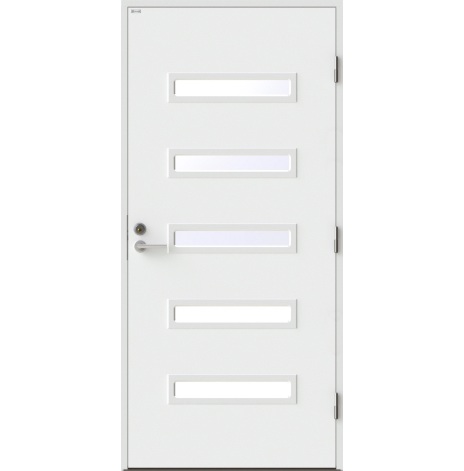 Angelica är en ytterdörr i modern stil med fem horisontella klarglas. Insidan är falsad, alltså en helt slät insida utan lister. Insidan är slät, men går att få dekorerad som utsidan. Dörr och karm levereras vit NCS S 0502-Y som standard.