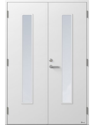 Kvalitetsytterdörr från NorDan - Bor parytterdörr - Linjalen 838PG med ett glas i vardera dörrblad. Svensktillverkade ytterdörrar av robust konstruktion med dubbla stålplåtar, extra klimatpackning samt kraftig, 56x105 mm, lamell-limmad, fingerskarvad och vakuumimpregnerad karm. Ytterdörren levereras med låskista ASSA 2002, utan cylinder och trycke. Handikappvänlig kantregel för enkel öppning och låsning av det passiva dörrbladet.
