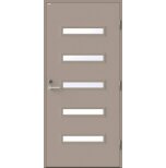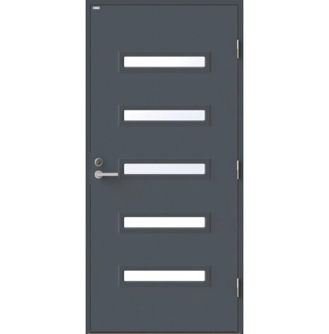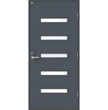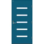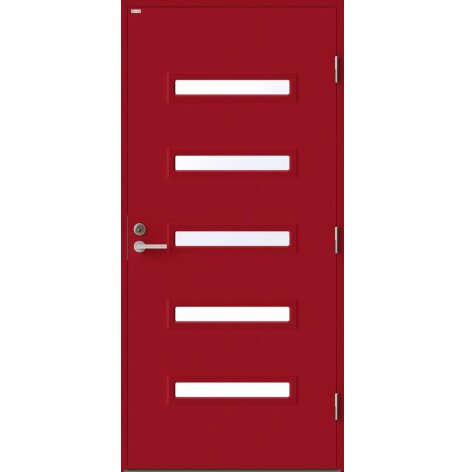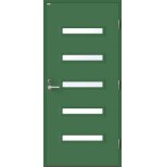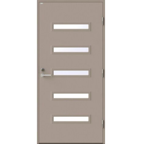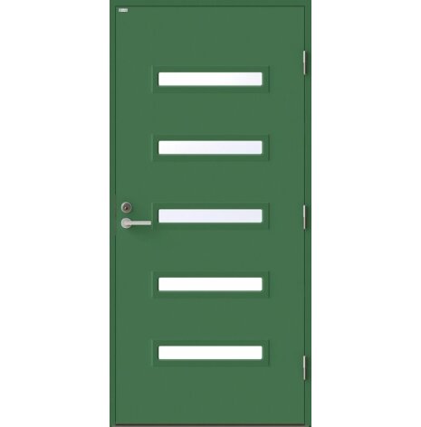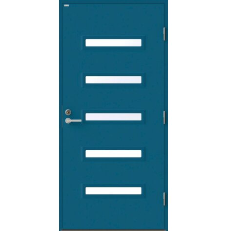 Angelica är en ytterdörr i modern stil med fem horisontella klarglas. Insidan är falsad, alltså en helt slät insida utan lister. Insidan är slät, men går att få dekorerad som utsidan. Dörr och karm levereras vit NCS S 0502-Y som standard.