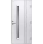 Natalie är en ytterdörr i modern stil med stående dekorspår och ett smalt, stående klarglas. Insidan är slät, men går att få dekorerad som utsidan. Dörr och karm levereras vit NCS S 0502-Y som standard.